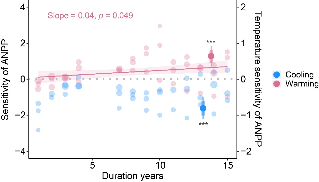 圖2 地上凈初級生產(chǎn)力對長期增溫和降溫的響應(yīng)