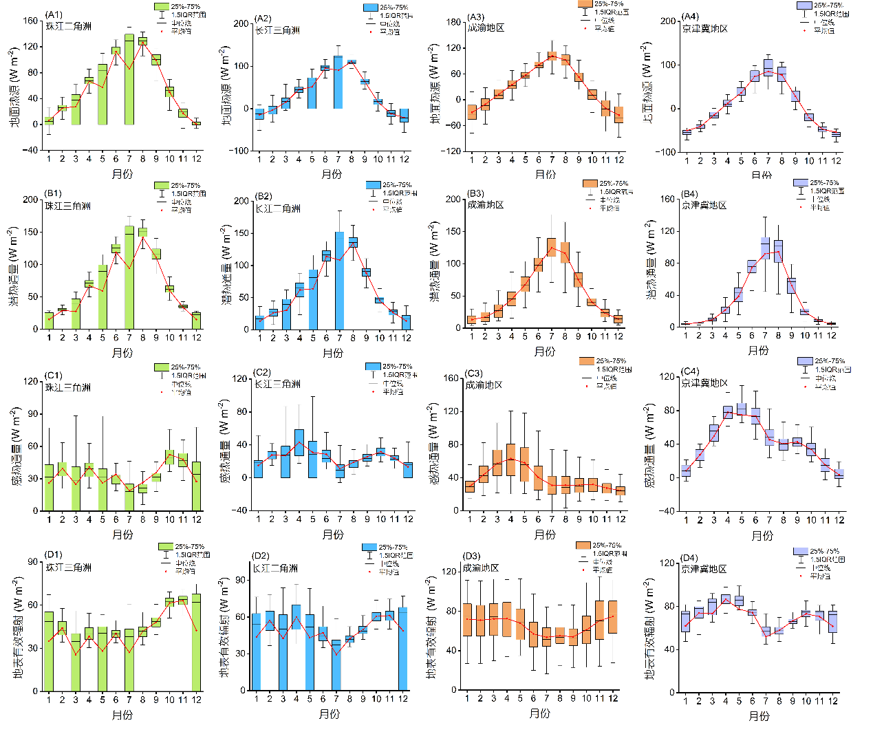 1979–2021年中國4個(gè)城市群能量變量的季節(jié)變化特征。(A) 地面熱源;(B) 潛熱通量;(C) 感熱通量;(D) 地表有效輻射。1:珠江三角洲;2:長江三角洲;3:成渝地區(qū);4:京津冀地區(qū);紅色實(shí)線為43年月均值