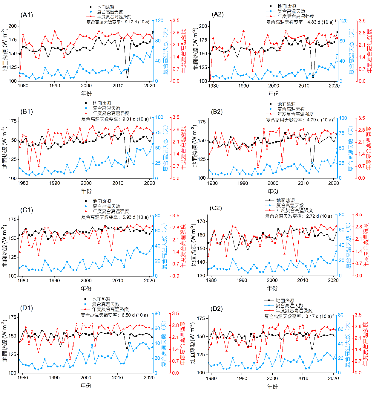 1979–2021年4個(gè)城市群地面熱源、復(fù)合高溫天數(shù)和年度復(fù)合高溫強(qiáng)度的年際變化。(A) 珠江三角洲;(B) 長江三角洲;(C) 成渝地區(qū);(D) 京津冀地區(qū)。1:基準(zhǔn)期1981–2010年;2:基準(zhǔn)期1991–2020年