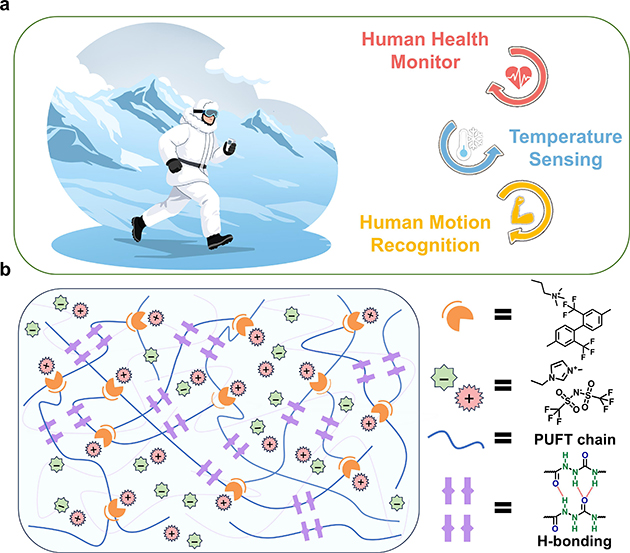 為探索聚氨酯材料的應(yīng)用潛力,基于上述研究,研究人員對聚氨酯材料內(nèi)部分子網(wǎng)絡(luò)設(shè)計(jì)和功能化進(jìn)行深入研究。為實(shí)現(xiàn)材料的導(dǎo)電性,引入更多具有額外極性的極性鍵是一種可能的策略,如碳-氟(C-F)鍵。由于F原子的高電負(fù)性,C-F鍵的強(qiáng)靜電性質(zhì)會增強(qiáng)進(jìn)入體系的電子極性,這樣陰離子和陽離子可彼此分布得更遠(yuǎn),在聚合物內(nèi)部移動(dòng)更自由?;诖?,研究人員提出了一種分子工程范式,利用氟的雙重功能在聚氨酯基質(zhì)中構(gòu)建空間相關(guān)但功能獨(dú)立的動(dòng)態(tài)網(wǎng)絡(luò)。通過引入含氟擴(kuò)鏈劑和多氫鍵單元,構(gòu)建了氟-陽離子相互作用與高密度氫鍵協(xié)同的動(dòng)態(tài)網(wǎng)絡(luò),氟的高電負(fù)性不僅與封端劑形成離子鍵增強(qiáng)網(wǎng)絡(luò)穩(wěn)定性,還通過偶極相互作用固定陽離子,構(gòu)建陰離子傳輸通道,保障離子高效遷移。從而成功制備了一種具備超敏感多參數(shù)監(jiān)測功能,可用于極地可穿戴設(shè)備形狀記憶聚氨酯材料。