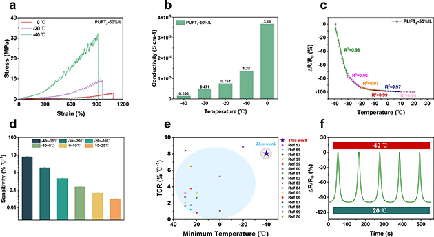 針對極地等極端環(huán)境的挑戰(zhàn),團(tuán)隊(duì)重點(diǎn)測試了材料的低溫耐受性。在-40℃時(shí),材料仍能保持較高的強(qiáng)度、韌性、可拉伸性和離子電導(dǎo)率。此外,該材料表現(xiàn)出負(fù)溫度系數(shù)行為,在-40℃至-30℃超低溫區(qū)間的溫度系數(shù)電阻高達(dá)8.05% ℃-1,且在連續(xù)熱循環(huán)測試中表現(xiàn)出良好的穩(wěn)定性和可重復(fù)性,彰顯了其在深冷環(huán)境下可靠應(yīng)用的潛力。