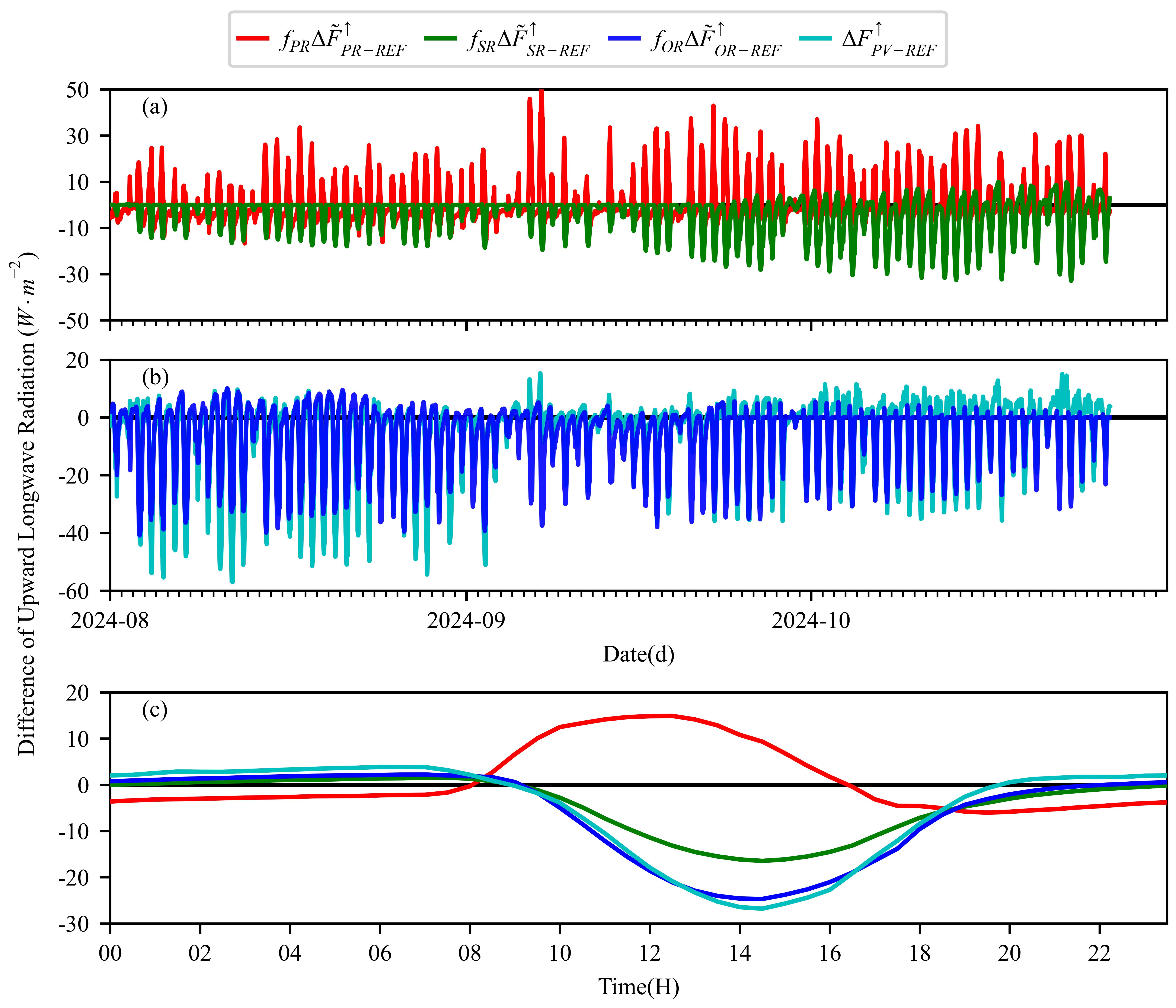 PV3R模型輸出的光伏電站內(nèi)外向上長波輻射通量密度之差各分量的逐日變化和平均日變化。(a):PV3R模型輸出的光伏陣列區(qū)和參考點向上長波輻射通量密度之差(f_PR ?F ?_(PR-REF)^↑)以及PV3R模型輸出的遮蔽區(qū)和參考點向上長波輻射通量密度之差(f_SR ?F ?_(SR-REF)^↑)的逐日變化;(b):PV3R模型輸出的非遮蔽區(qū)和參考點向上長波輻射通量密度之差(f_OR ?F ?_(OR-REF)^↑)以及觀測到的光伏電站內(nèi)外向上長波輻射通量密度之差(?F_(PV-REF)^↑)的逐日變化;(c):f_PR ?F ?_(PR-REF)^↑、f_SR ?F ?_(SR-REF)^↑、f_OR ?F ?_(OR-REF)^↑和?F_(PV-REF)^↑的平均日變化。