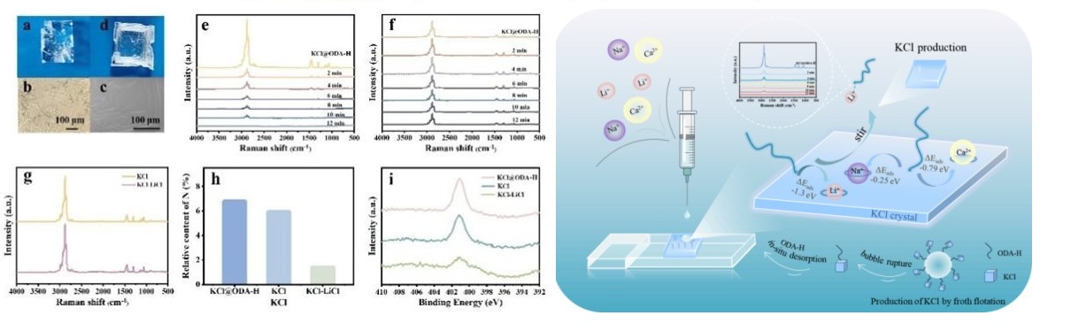 研究發(fā)現(xiàn),陽離子種類顯著影響ODA-H的脫附效果,其中Li+的促進作用最明顯。通過原位拉曼光譜驗證,明確了脫附效果由Li+的主動作用驅(qū)動導致,且該策略在酸性、中性體系中均能穩(wěn)定起效。DFT計算結(jié)果表明,Li+可嵌入KCl晶格結(jié)構(gòu)中,引發(fā)KCl表面的局部晶格形變,減弱了ODA-H與KCl表面的結(jié)合力;同時,Li+對ODA-H具有強吸附作用,可定向驅(qū)動ODA-H脫離KCl固體表面,最終實現(xiàn)高鹽體系下的高效原位去除。