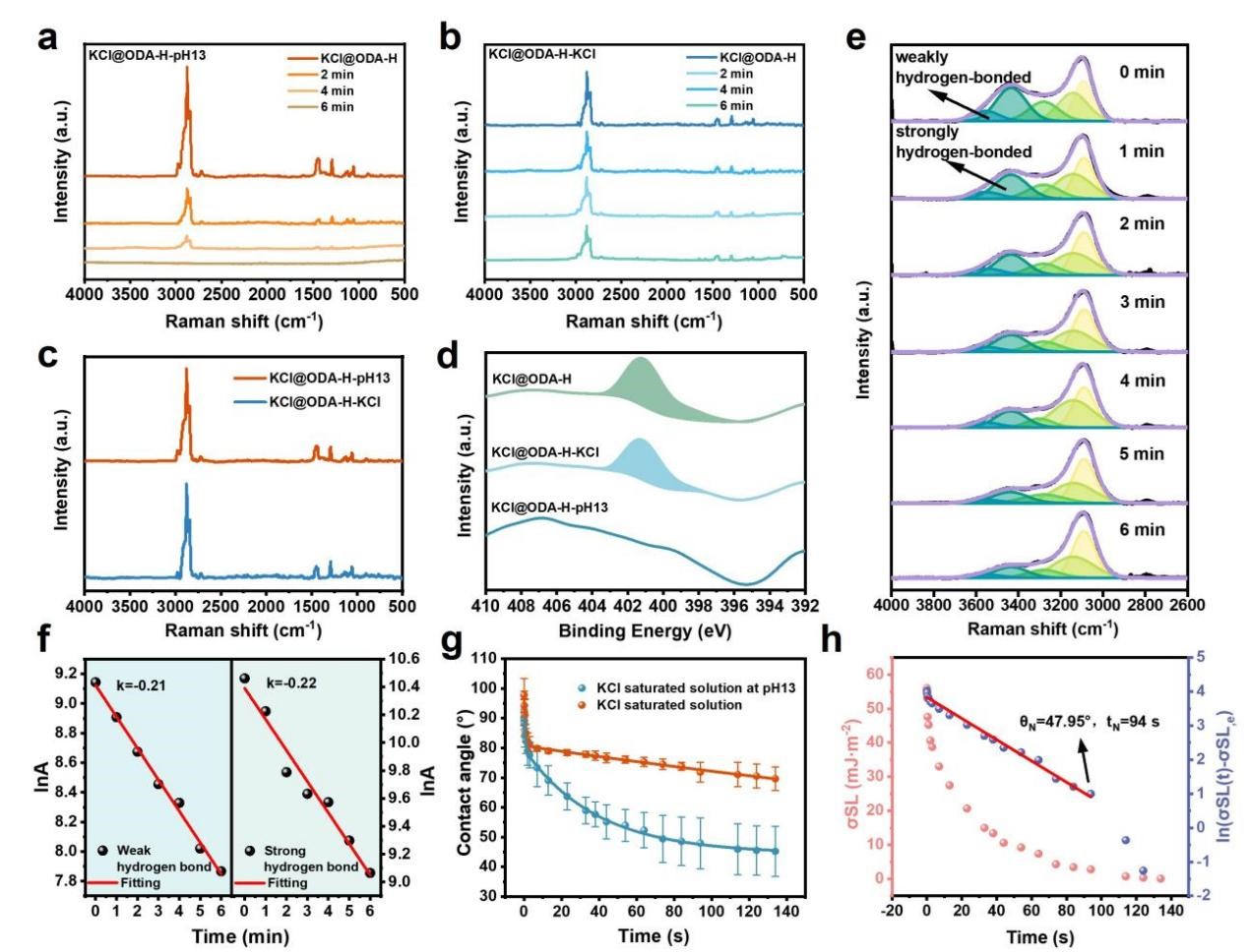 另一項工作則通過以堿度調(diào)控方式提高ODA-H的原位脫附效率,其KCl表面ODA-H的脫附率達到87%。MD模擬計算表明,OH?導致親水基團(-NH3+)去質(zhì)子化,破壞了ODA-H與KCl表面之間的靜電相互作用,并在堿性條件下促使親水基團脫離KCl表面。該機制可通過以下三個遞進階段系統(tǒng)闡明:(1)OH?誘導ODA-H脫附;(2)固–液界面張力降低;(3)擴散過程加速,從而促進OH?向吸附位點的高效傳輸。