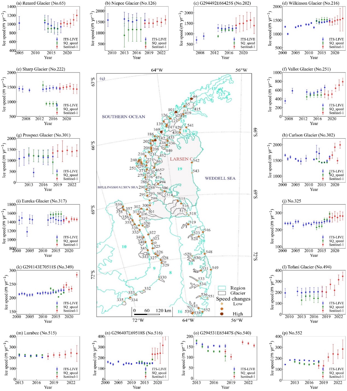 中國科學(xué)院西北生態(tài)環(huán)境資源研究院冰凍圈科學(xué)與凍土工程全國重點(diǎn)實(shí)驗(yàn)室康世昌研究員團(tuán)隊(duì),通過2018–2023年Sentinel-1 SAR影像反演獲得6181組有效冰川流速數(shù)據(jù),系統(tǒng)揭示了南極半島冰川流速的時(shí)空變化特征及空間差異規(guī)律。