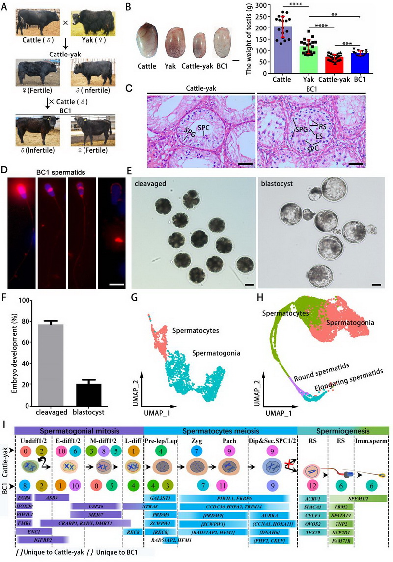 論文代表圖1:普通牛和牦牛雜交后代和回交睪丸組織單細(xì)胞圖譜分析。A) 普通牛與牦牛雜交產(chǎn)生犏牛及其回交后代(BC1)的模型示意圖。B) 牦牛、家牛、犏牛及BC1的睪丸重量對(duì)比,比例尺 = 2 厘米;普通牛(n = 18)、牦牛(n = 21)、犏牛(n = 37)和BC1(n = 13)的睪丸重量進(jìn)行兩兩比較。C) 犏牛(左)和BC1(右)睪丸組織的蘇木精-伊紅(H&E)染色切片。比例尺 = 50 μm。在犏牛中未觀察到精母細(xì)胞階段以后的生精細(xì)胞,而與犏牛相比,BC1的生精缺陷有所緩解。SPG:精原細(xì)胞,SPC:精母細(xì)胞,RS:圓形精子細(xì)胞,ES:伸長精子細(xì)胞。D) 從BC1睪丸中分離出的精子細(xì)胞頂體染色。比例尺 = 10 μm。E & F) BC1精子細(xì)胞胞質(zhì)內(nèi)注射入牦牛卵母細(xì)胞后獲得了部分卵裂期胚胎和囊胚期胚胎;比例尺 = 50 μm。G) 犏牛生殖細(xì)胞的UMAP標(biāo)注圖,僅識(shí)別出兩種亞型:精原細(xì)胞和精母細(xì)胞。H) BC1生殖細(xì)胞的UMAP標(biāo)注圖,識(shí)別出精原細(xì)胞、精母細(xì)胞、圓形精子細(xì)胞和伸長精子細(xì)胞。I) 犏牛和BC1生殖細(xì)胞各簇中特定標(biāo)記基因的表達(dá)情況,可用于細(xì)胞類型鑒定。