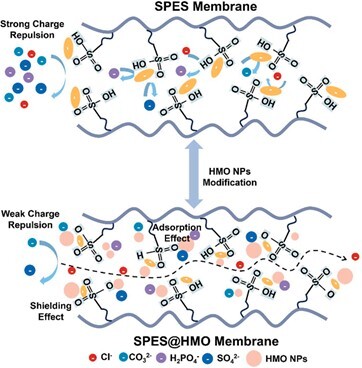 針對(duì)上述挑戰(zhàn),中國(guó)科學(xué)院青海鹽湖研究所離子吸附科學(xué)與技術(shù)課題組提出了一種氯離子膜“電荷屏蔽效應(yīng)”設(shè)計(jì)策略,開(kāi)發(fā)了一種由磺化聚醚砜(SPES)與水合錳氧化物(HMO)顆粒復(fù)合的新型混合基質(zhì)膜-氯離子吸附膜(SPES@HMO)。該膜利用HMO納米顆粒調(diào)控膜界面電荷環(huán)境,從而特異性增強(qiáng)氯離子的傳輸,同時(shí)結(jié)合競(jìng)爭(zhēng)吸附機(jī)制抑制多價(jià)陰離子的通過(guò),為高鹽廢水中氯離子的高精度篩分提供了全新解決方案。
