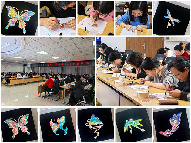 3月13日下午,組織開展了“指尖傳非遺”點(diǎn)翠DIY活動(dòng)。培訓(xùn)老師向大家介紹了中國點(diǎn)翠工藝非物質(zhì)文化遺產(chǎn)的歷史底蘊(yùn)和文化價(jià)值,詳細(xì)講解了點(diǎn)翠胸針的制作過程。涂抹亮油、貼貝殼碎片、表面封層、定型……一片片細(xì)小的螺鈿片鑲嵌在胚底,斑斕色彩流動(dòng)交融,鮮活生動(dòng)?;顒?dòng)帶大家品味了傳統(tǒng)工藝的浪漫、領(lǐng)略了沉淀千年的藝術(shù)瑰寶。