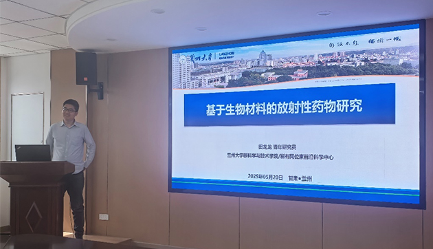 田龍龍作了題為“基于生物材料的放射性藥物研究”的報(bào)告。介紹了醫(yī)用核素的國內(nèi)外發(fā)展現(xiàn)狀以及我國醫(yī)用核素治療藥物的發(fā)展歷程及相關(guān)政策。重點(diǎn)分享了其團(tuán)隊(duì)在核素藥物研究方面的系列成果,特別是在利用生物材料增強(qiáng)核藥治療效果方面的最新研究進(jìn)展,他們通過以細(xì)菌合成的聚合物微球材料緩釋病原相關(guān)分子、天然松花粉作為載體緩釋多糖、生物來源的囊泡激活天然免疫等策略構(gòu)建靶向核素治療藥物、近距離放療的核素治療藥物,最終實(shí)現(xiàn)低劑量、強(qiáng)效的核素-免疫聯(lián)合治療。