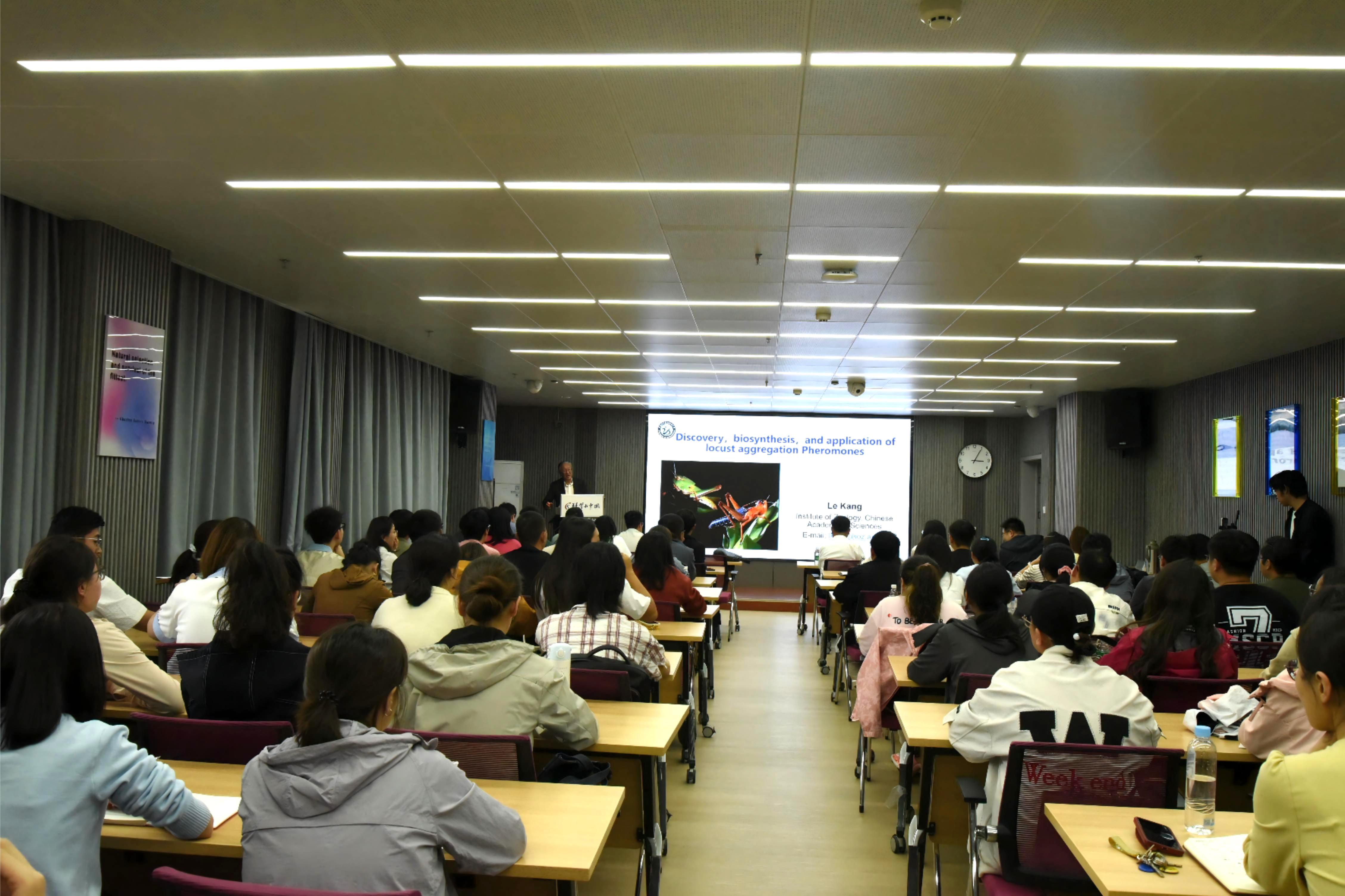 講座環(huán)節(jié),康樂院士詳細闡述了蝗蟲群聚信息素的發(fā)現(xiàn)研究過程和注意細節(jié),從基礎理論到應用實踐,層層剖析,向大家講解了蝗蟲群聚信息素的發(fā)現(xiàn)、生物合成和應用,生動的講解了蝗蟲群聚信息素4-乙烯基苯甲醚(4VA)在蝗蟲體內產生的過程,以及蝗蟲利用植物中常見的氨基酸來合成自己特異的群聚信息素?;趯?VA生物合成途徑的解析,康樂院士研究團隊設計出一種小分子抑制劑,能夠精準調控4VA的合成和釋放,從而有效干預蝗蟲的群聚行為。為蝗災“綠色防控”提供了全新技術方案,為開發(fā)與利用昆蟲信息素實現(xiàn)精準調控害蟲行為提供了新的思路,推動了害蟲綠色可持續(xù)防控的發(fā)展。