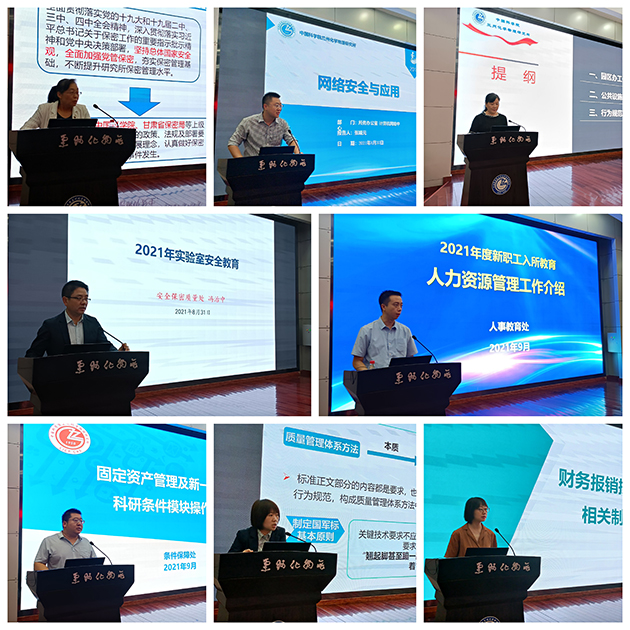 此次教育培訓(xùn)分為業(yè)務(wù)培訓(xùn)和專題培訓(xùn),業(yè)務(wù)培訓(xùn)主要由所務(wù)辦公室、黨委辦公室、科研與規(guī)劃處、人事教育處、財(cái)務(wù)處、條件保障處、公共技術(shù)中心等分別就所情所況、黨建、論文發(fā)表、人事人才、財(cái)務(wù)制度與報(bào)銷管理流程、固定資產(chǎn)管理與政府采購、公共設(shè)施使用與行為規(guī)范、公共平臺建設(shè)與運(yùn)維等進(jìn)行了介紹。專題培訓(xùn)主要包括實(shí)驗(yàn)室安全教育、網(wǎng)絡(luò)安全與應(yīng)用、保密教育、質(zhì)量管理體系建設(shè)與運(yùn)行、館藏文獻(xiàn)與數(shù)據(jù)庫應(yīng)用等,并就質(zhì)量管理體系和安全教育培訓(xùn)組織了考試。