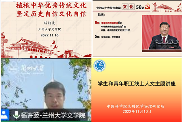 為深入貫徹落實(shí)黨的二十大精神,進(jìn)一步教育引導(dǎo)廣大研究生和青年職工堅(jiān)定文化自信,弘揚(yáng)中華優(yōu)秀傳統(tǒng)文化,11月10日,中國科學(xué)院蘭州化學(xué)物理研究所舉辦了研究生和青年職工線上人文主題講座。全所研究生、課題生和青年職工430余人參加講座。
