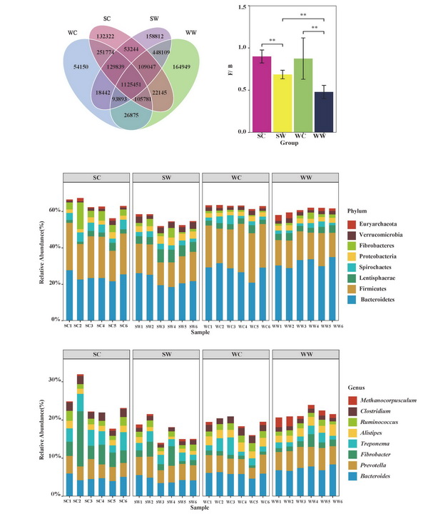 圖1(a)不同環(huán)境下藏野驢腸道菌群基因數(shù)目花瓣圖;在門水平(b)和屬水平(c)上,藏野驢腸道菌群相對物種豐度直方圖;(d) F/B值的分析