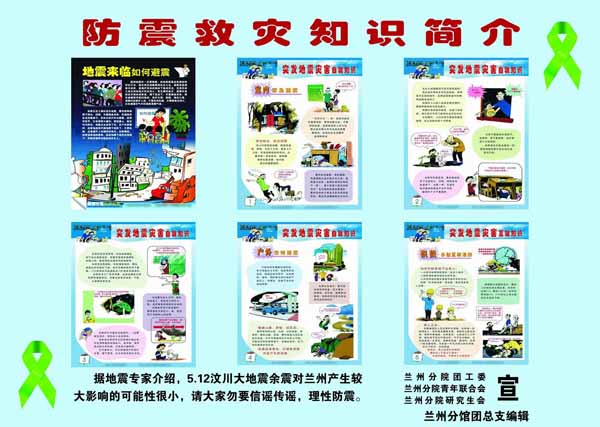 為正確引導(dǎo)廣大團員青年堅定信心,沉著應(yīng)對地震災(zāi)害,防止地震謠言的傳播和擴散,維護良好的社會秩序和有序的工作環(huán)境,蘭州分院團工委會同蘭州分院青年聯(lián)合會、研究生會迅速組織力量編輯制作了《中國科學(xué)院蘭州分院防震抗震知識讀本》和“防震救災(zāi)知識簡介”宣傳畫,并在蘭州分院各單位分發(fā)、宣傳,特別是在科學(xué)院中學(xué)和小學(xué)大范圍發(fā)放和張貼,有效加強了中小學(xué)生的防震抗震知識和緊急逃生救護常識,受到有關(guān)方面的歡迎,取得了良好的社會效益。
