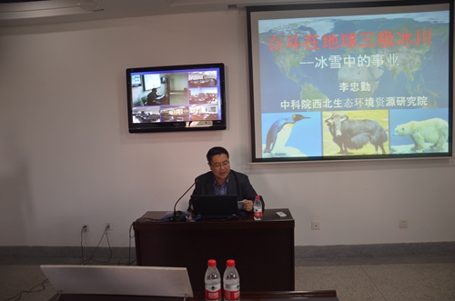 李忠勤結合自己在高寒極端環(huán)境無私奉獻30年的難忘工作經(jīng)歷,為與會人員深情講述了他《奮斗在地球三極冰川》的感人故事。他的報告分“北極科學考察介紹”、“走進南極”和“中國冰川定位觀測”三個部分,通過普及地球三極(南極、北極和青藏高原)知識、梳理回顧世界及中國冰川科考歷史、介紹中國冰川科考站情況及科考隊感人事跡,為大家作了一場生動、感人的報告,一幅幅珍貴難得的實地照片再現(xiàn)了冰川科考工作的極端艱辛,一句句深情感人的樸實語言展示了共產(chǎn)黨人無私奉獻的政治品格。同時,他強調(diào)指出,他所在的科研團隊結合冰凍圈科學研究以野外工作為基礎,具有人員分散、工作辛苦等特點的實際,制定了以黨小組為單元,研究室支部、所黨委聯(lián)動的“兩學一做”方案,以科研工作為載體和抓手,深入扎實推進“兩學一做”學習教育,取得了良好效果,發(fā)揮了黨支部是戰(zhàn)斗堡壘作用。他的報告圖文并茂,真實感人,既是一場科普報告,更是一場生動黨課,受到與會人員歡迎和好評。