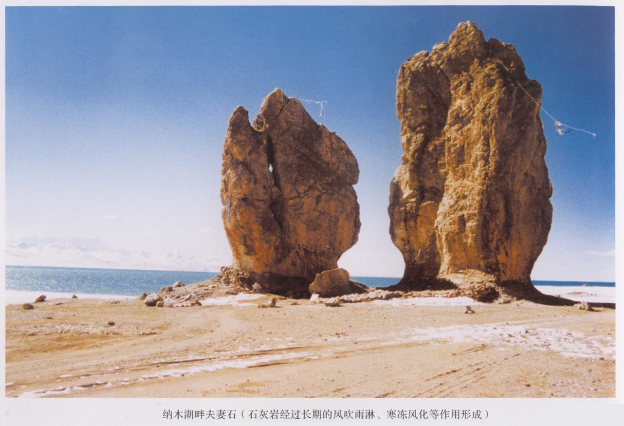 青藏高原石灰?guī)r的分布面積約20萬(wàn)平方公里,大自然的神工鬼斧雕塑了奇形怪狀的巖溶形態(tài)。位于高原東緣的龍、九寨溝是石灰?guī)r溶蝕和碳酸鈣沉積形成的巖溶景色的代表,在高原腹地的唐古拉山山坡安多山上有巖溶洞、巖溶峰和其它奇形怪狀的巖溶地貌。在西藏昌都附近的大喇嘛山下有一排似長(zhǎng)城?樣的峰林墻組合。在阿里地區(qū)的班公湖畔有許多峰林溶洞,是鳥(niǎo)類棲息的最佳天然場(chǎng)所,形成了藍(lán)天、白云、鳥(niǎo)飛、魚(yú)躍、湖靜、岸奇的人間仙 境。在青藏公路沿線的雁石坪溫泉一帶也分布著由泉華堆積形成的泉華錐和石灰?guī)r造型。